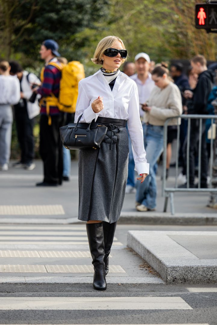 グレーのペンシルスカートにシャツを合わせた、端正なスタイリング。タイトなシルエットに対して、ロングブーツで足元に重さを加え、甘さを抑えた辛口なムード。
