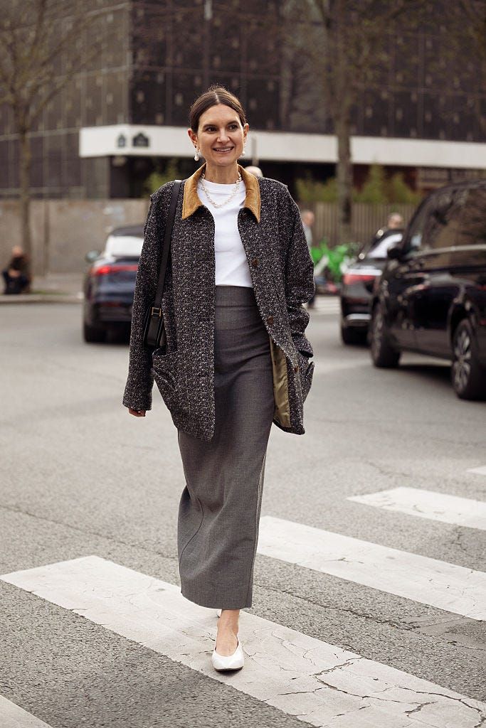 ツイードジャケットでクラシックなムードを取り入れつつ、程よくゆとりのあるシルエットでかっちりしすぎないバランスに。グレーのペンシルスカートで縦のラインを強調しながらも、どこか媚びない、洗練された印象をつくって。