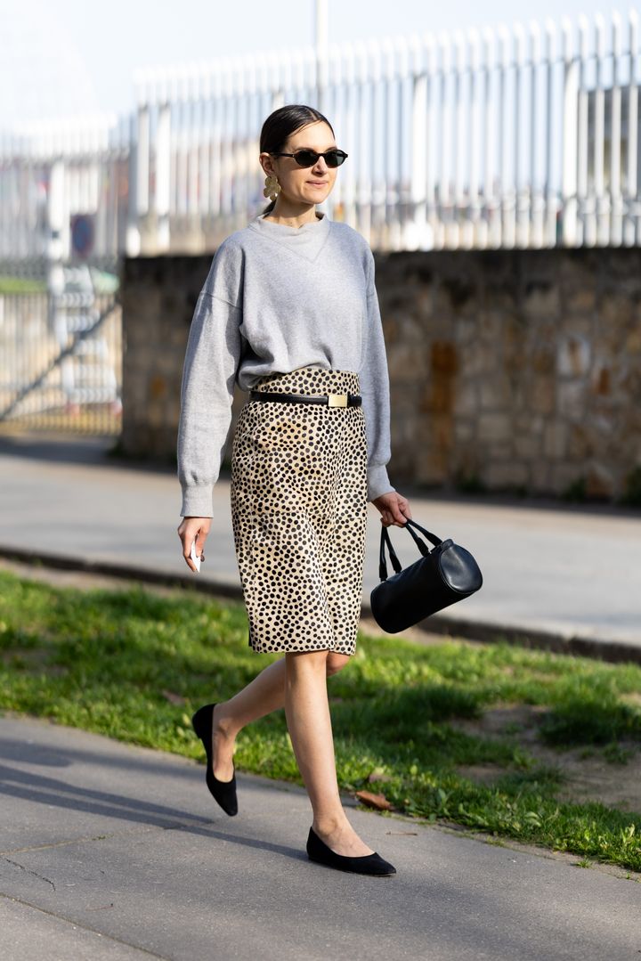 レオパード柄のスカートを主役に、グレーのスウェットでラフに中和。細ベルトやトレンドの横長バッグを合わせることで、カジュアルな中にクリーンさをプラス。