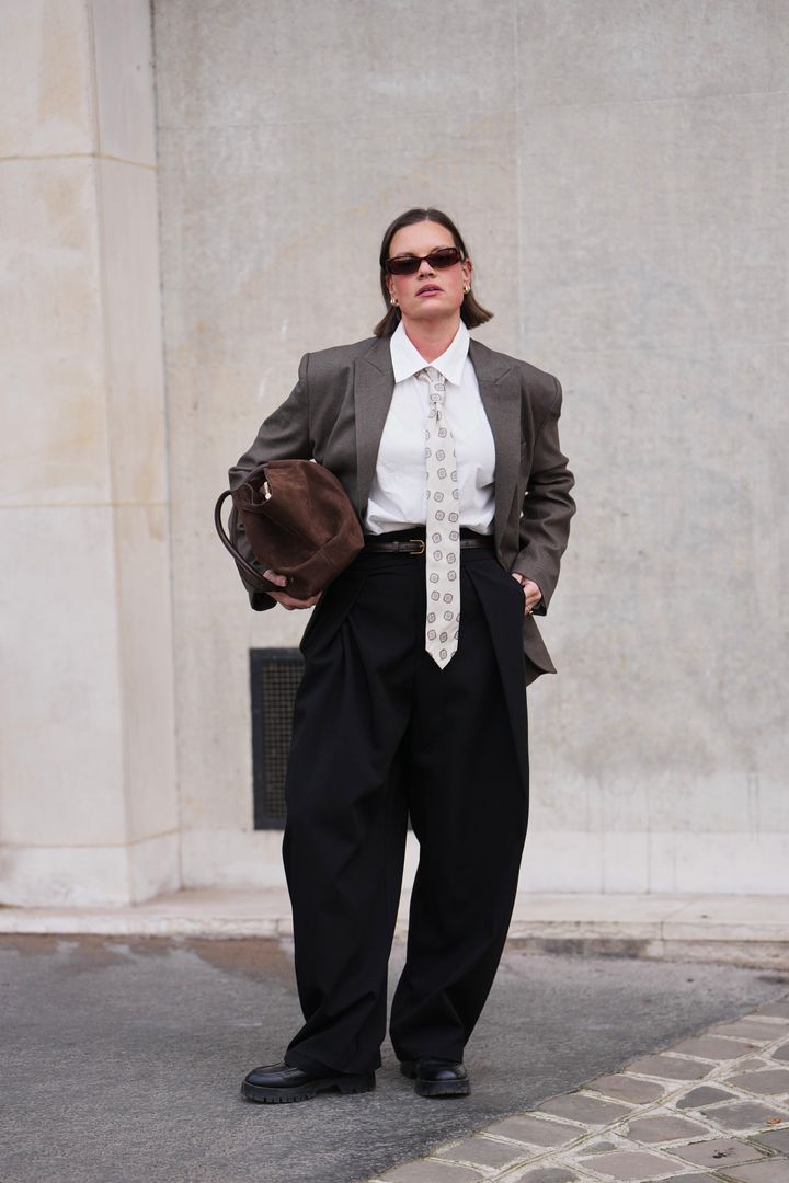 テーラードジャケットにシャツ&ネクタイを合わせたスタイリングには、あえてネクタイを長めに垂らしてかっちりとした印象をほどよく崩したのがポイント。バッグはクラッチのように抱えて持つことで、スタイリングにさりげないニュアンスをプラス。