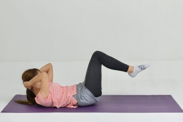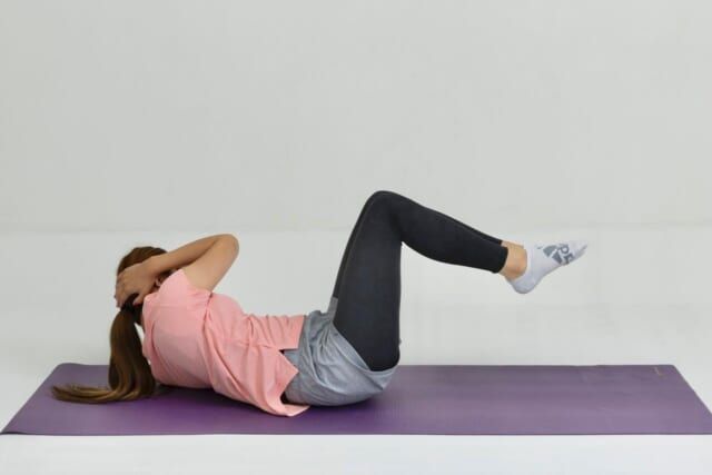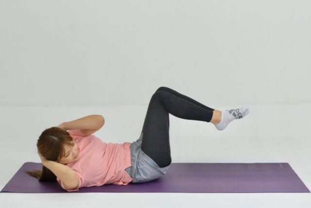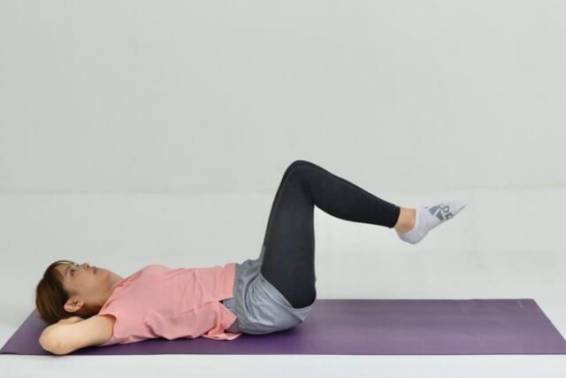 仰向けになり、ひざを立てて両脚を持ち上げます。すねは床と平行に。腰が反らない位置で、お腹に軽く力を入れておきます。