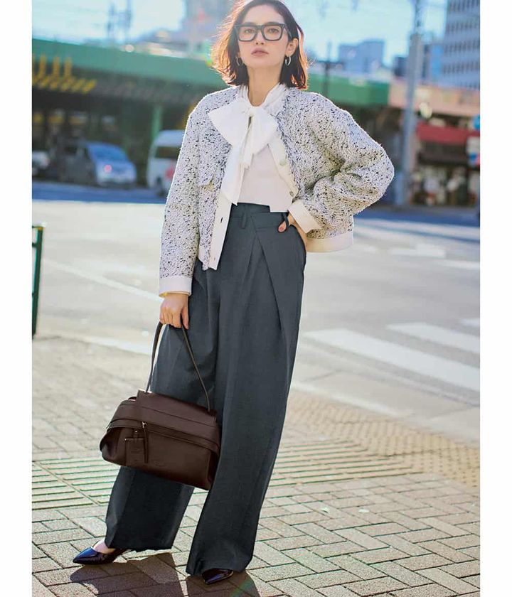 パンツ¥33,000(イウエン マトフ/ユナイテッドアローズ 渋谷スクランブルスクエア店)ブルゾン¥132,000(デパリエ/デパリエ 伊勢丹新宿店)ブラウス¥19,910(23区/オンワード樫山 お客様相談室)バッグ¥328,900(トッズ/トッズ・ジャパン)シューズ¥145,200(ジャンヴィト ロッシ/ジャンヴィト ロッシ ジャパン)メガネ¥49,500(モスコット/モスコット アオヤマ)ピアス¥28,600(ブランイリス/ブランイリストーキョー)