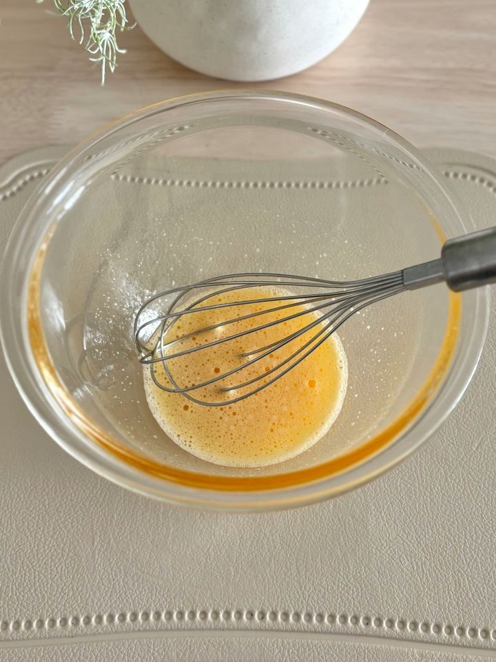 最初の卵と砂糖は白っぽくなるまで混ぜます。