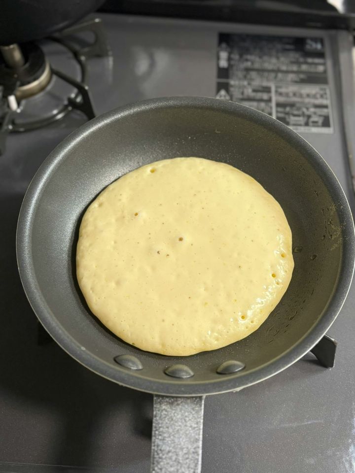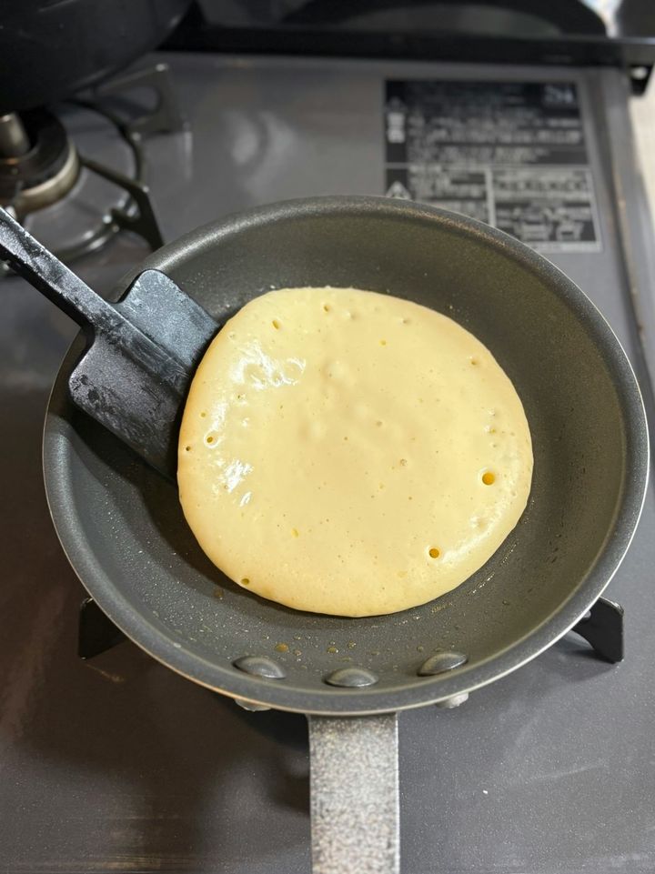 ひっくり返すタイミングは、写真2枚目のように生地中央にポコポコと気泡が現れたらひっくり返しても良い合図です。
