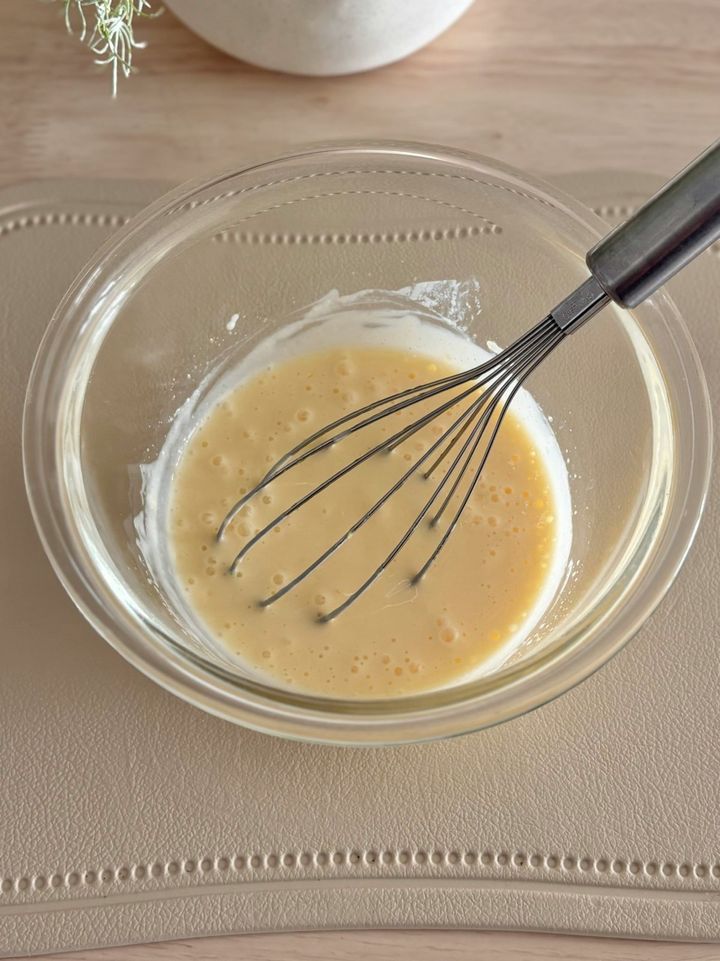 そしてここが一番重要で、ふるった薄力粉を加えたら4枚目の写真のように”粉が溶けきらずダマが残っている状態”で混ぜるのを止めてください。