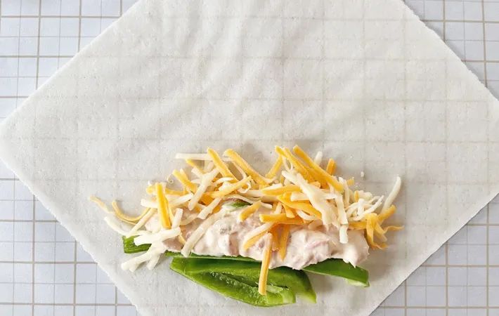 まな板などの上に春巻きの皮を1枚置き、ピーマン、ツナマヨ、ピザ用チーズをのせます。