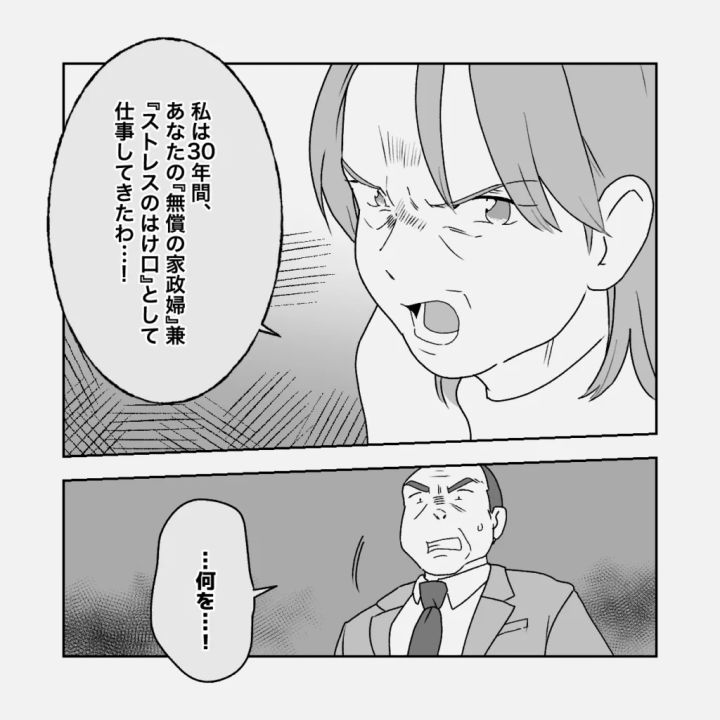 「私は30年間、あなたの『無償の家政婦』兼『ストレスのはけ口』として仕事してきたわ・・!」と義父を睨みつけてそう言い放った義母。義父は、義母の迫力にたじろぎました。
