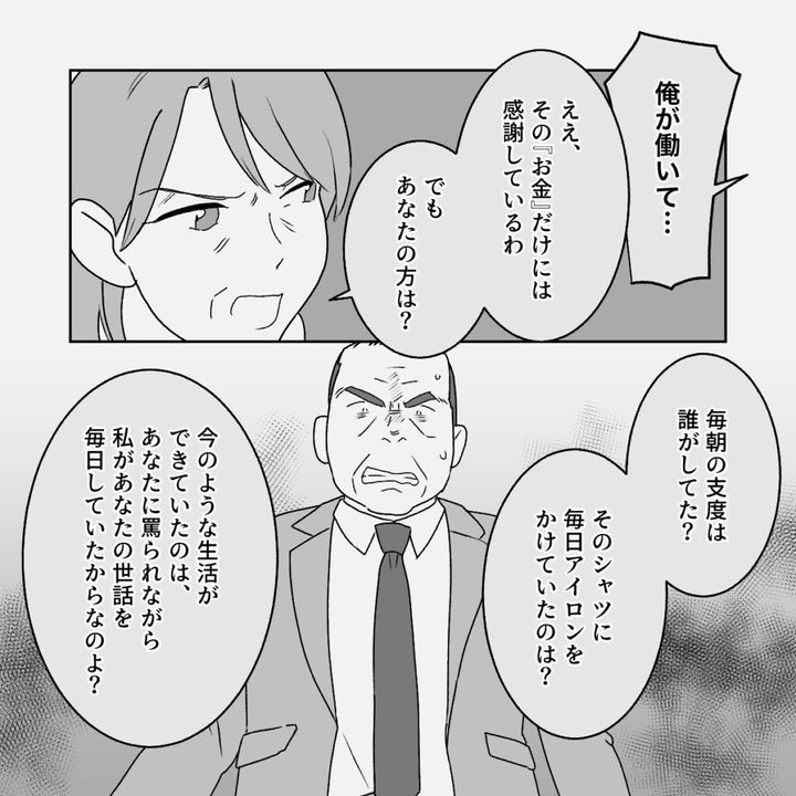 「俺が働いて・・」と言う義父の声を遮り、「ええ、その『お金』だけには感謝しているわ。でもあなたの方は?」と義母が義父に詰め寄ります。「毎朝の支度は誰がしてた?そのシャツに毎日アイロンをかけていたのは?今のような生活ができていたのは、あなたに罵られながら私があなたの世話を毎日していたからなのよ?」義母の強い言葉に何も言えなくなった義父は、