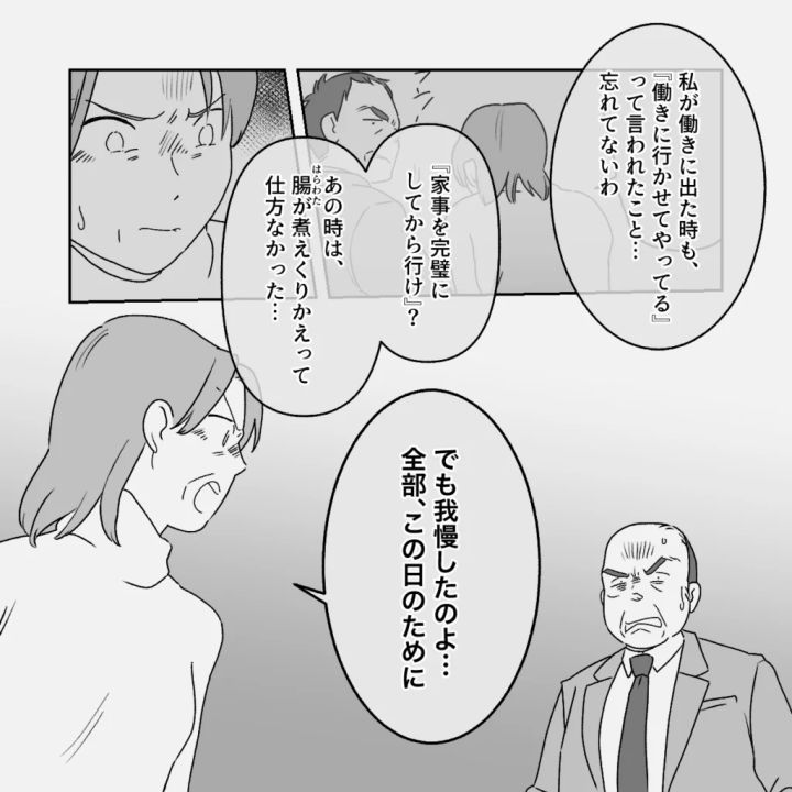 「私が働きに出た時も、『働きに行かせてやってる』って言われたこと・・忘れてないわ。『家事を完璧にしてから行け』?あの時は、腸が煮えくり返って仕方がなかった・・でも我慢したのよ・・全部、この日のために」義母の言葉に義父は何も言えず、ただただ立ち尽くしました。