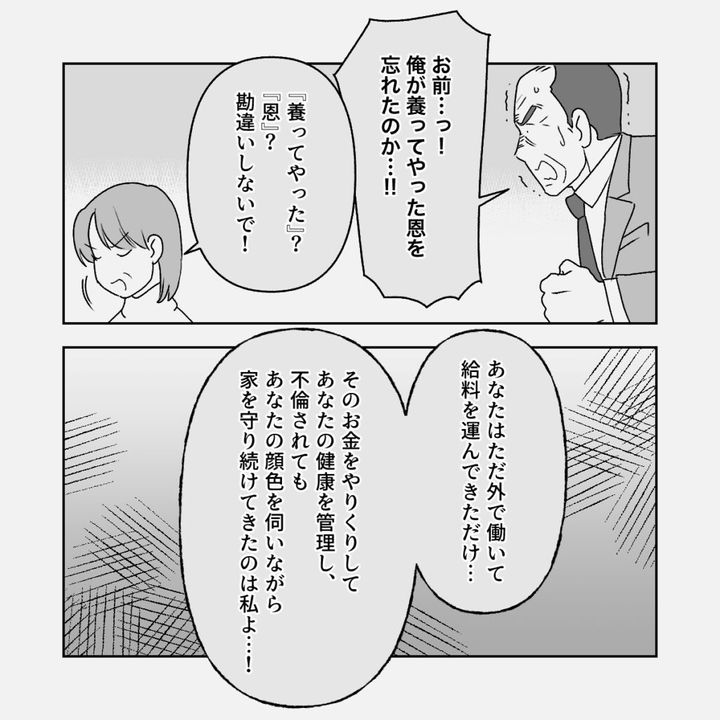 「お前・・っ!俺が養ってやった恩を忘れたのか・・!!」と声を震わせながら言い返すも、「『養ってやった』?『恩』?勘違いしないで!あなたはただ外で働いて給料を運んできただけ・・。そのお金をやりくりしてあなたの健康を管理し、不倫されてもあなたの顔色を伺いながら家を守り続けてきたのは私よ・・!」義母はそう言った後、