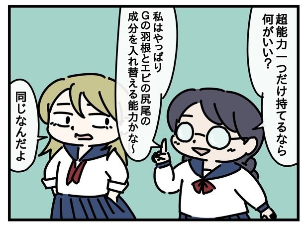 物語は、「もし超能力一つだけ持てるなら何がいい?」という話題から始まる。黒髪で三つ編みの女の子は、「私はやっぱりGの羽根とエビの尻尾の成分を入れ替える能力かな~」と斜め上な回答。これに金髪ロングの女の子は「同じなんだよ」と正論を返しつつ、自身は寝坊しても電車に乗り遅れないことを理由に「瞬間移動かな」と答える。それを聞いた三つ編みの女の子は――。