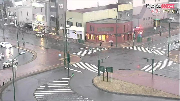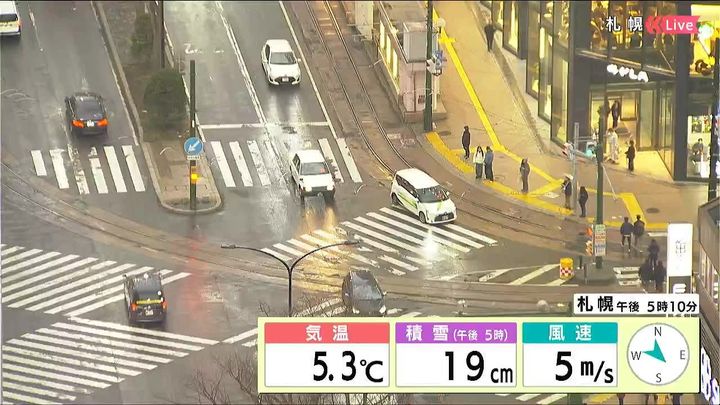 札幌の路面は濡れていて、傘をさしている人もいます。