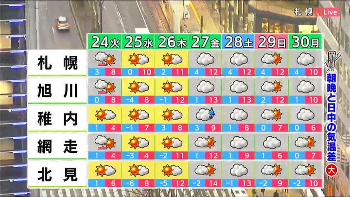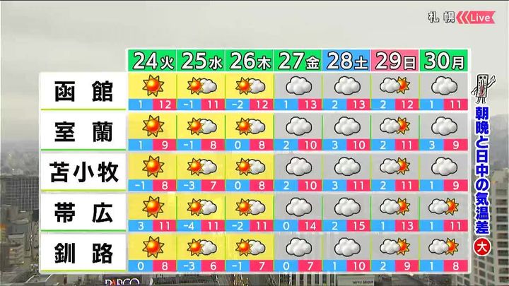 木曜まで各地で晴れるでしょう。週末は雲が広がります。函館や帯広など日中は10度以上まで上がりますが、朝晩との気温差が大きくなるでしょう。