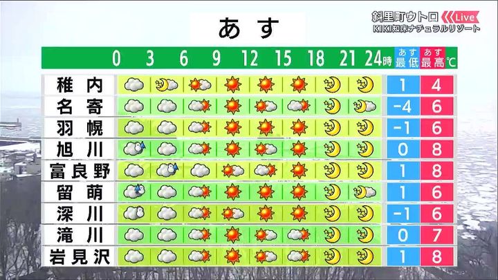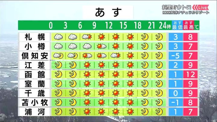 札幌や小樽で朝まで曇りますが、その他はよく晴れます。函館の最高気温は12度で日差しが暖かいでしょう。札幌は8度で、冷たい北風が少し強まりそうです。