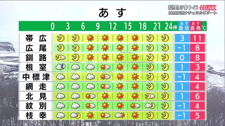 帯広や釧路は晴れて、気温が上がります。根室やオホーツク海側は昼頃から晴れますが、北風の影響で、最高気温は4度くらいにとどまります。