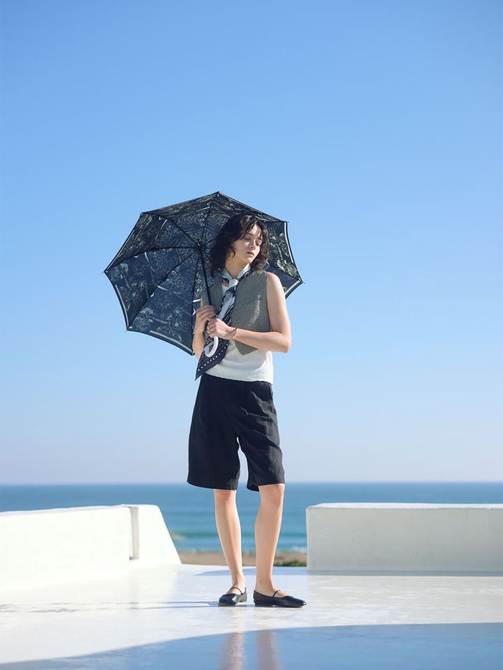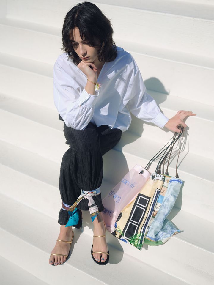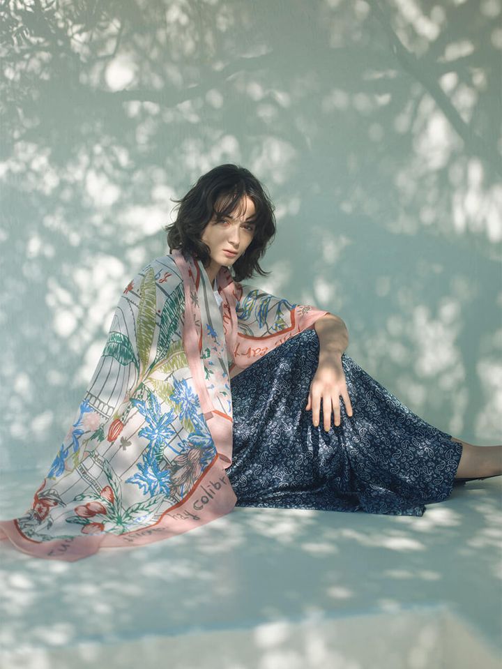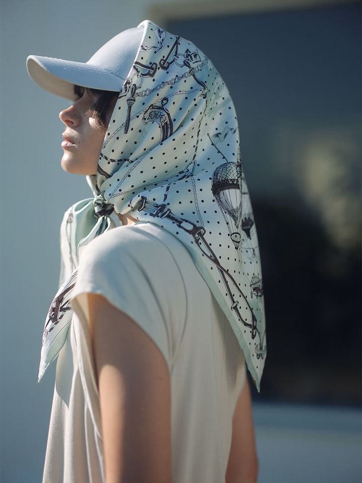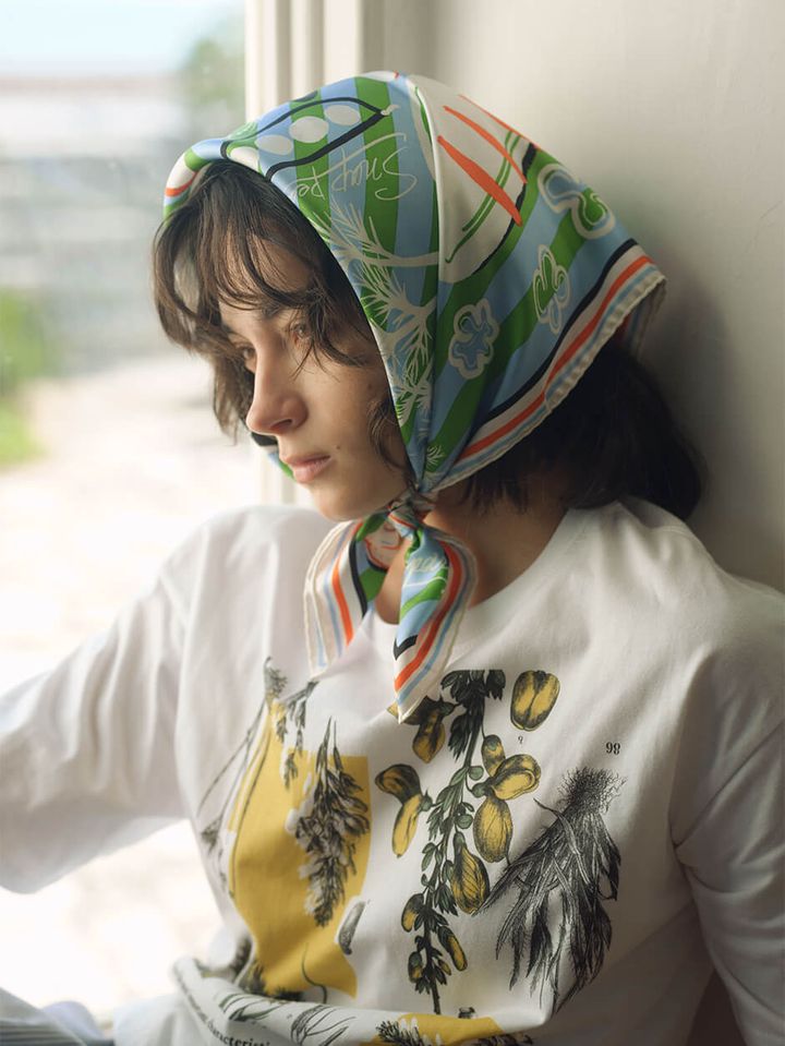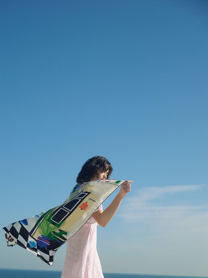 過去の記憶と想像の風景が重なり合うスカーフは、巻き方によって多彩な表情を見せ、日常の装いに小さな開放感を添えてくれる。