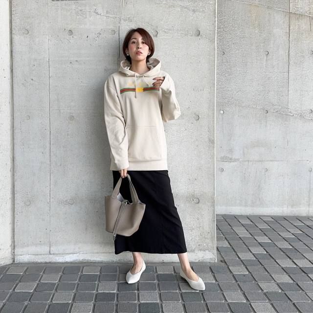 オーバーサイズのパーカーなら「タイトスカート」と相性バツグン。ダボッとしたシルエットのパーカーが真面目な雰囲気のタイトスカートにラフ感をプラスし、コーデをカジュアルダウンしてくれます。