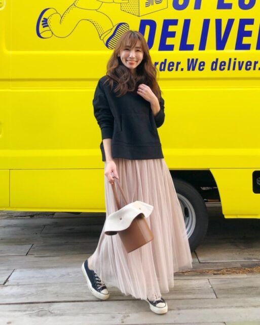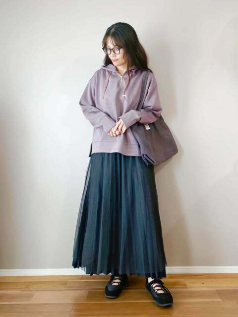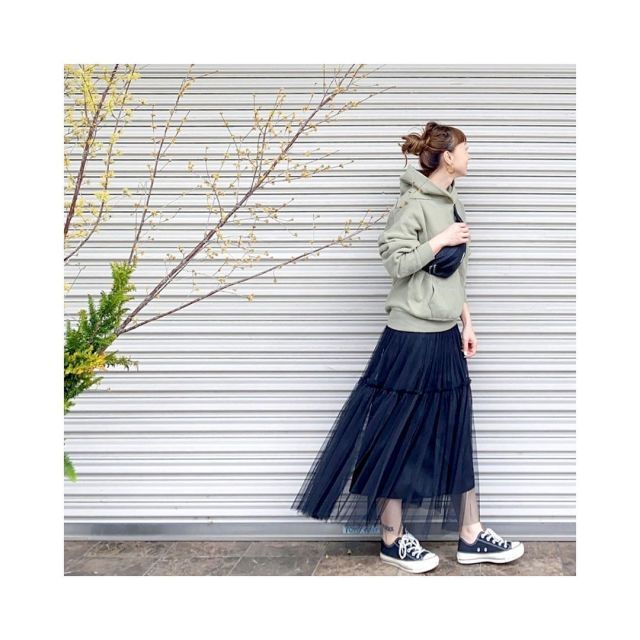 パーカーは「チュールスカート」とも合わせやすいですよ。ガーリーに寄りやすいスカートの甘さを抑えながら、普段使いの装いに。チュールスカートの軽やかさがより映え、シーズンムードに馴染みますよ。