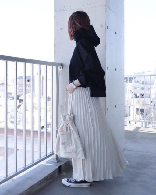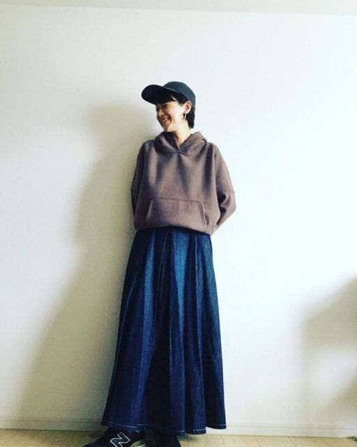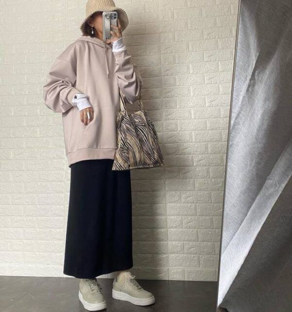 「パーカーにスカートを合わせると古臭く見える」、そう悩んでいる人も多い様子。まずプルオーバータイプのパーカーに合わせるスカートはロング丈が最適です。中途半端な長さのスカートに合わせると、パーカーコーデが昔っぽく見える原因に。