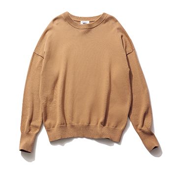 キャメルクルーネックニット/HER. 穏やかなキャメルカラー。そでは長めの設計で、たるませて着ると手元に洒脱なニュアンスが加わる。ブラウンよりも淡く、ベージュよりもはっきりするキャメルの色みがゆるいニットには好都合。