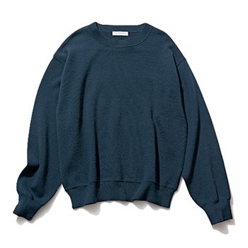 ざっくりとした厚手の生地に、ゆとりを持たせた大きな身幅。ドライなオーバーニットは、リアルタイムに見合ったぬくもりを補いながら、装いに抑揚を添えてくれる。