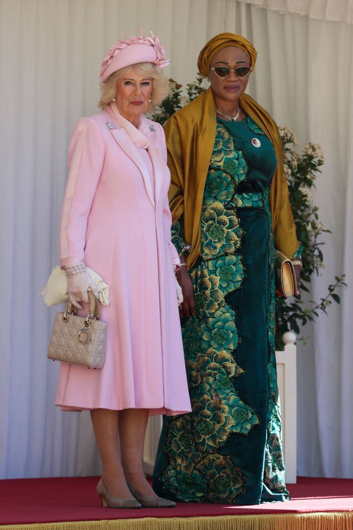 カミラ王妃は、クリーム色の豪華なジャガード素材のドレスに、サファイアのティアラを着用。こちらもドレスはフィオナ・クレアのもので着回しですが、最も勲章やサッシュが映える白でナイジェリアカラーを意識されての選択と推測。