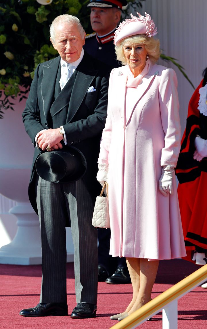 ここでは国王ご夫妻と皇太子ご夫妻が出席。モーニングスタイルの国王と皇太子のお隣で、やはりというべきか、この日も最も華やかなファッションだったのはカミラ王妃。