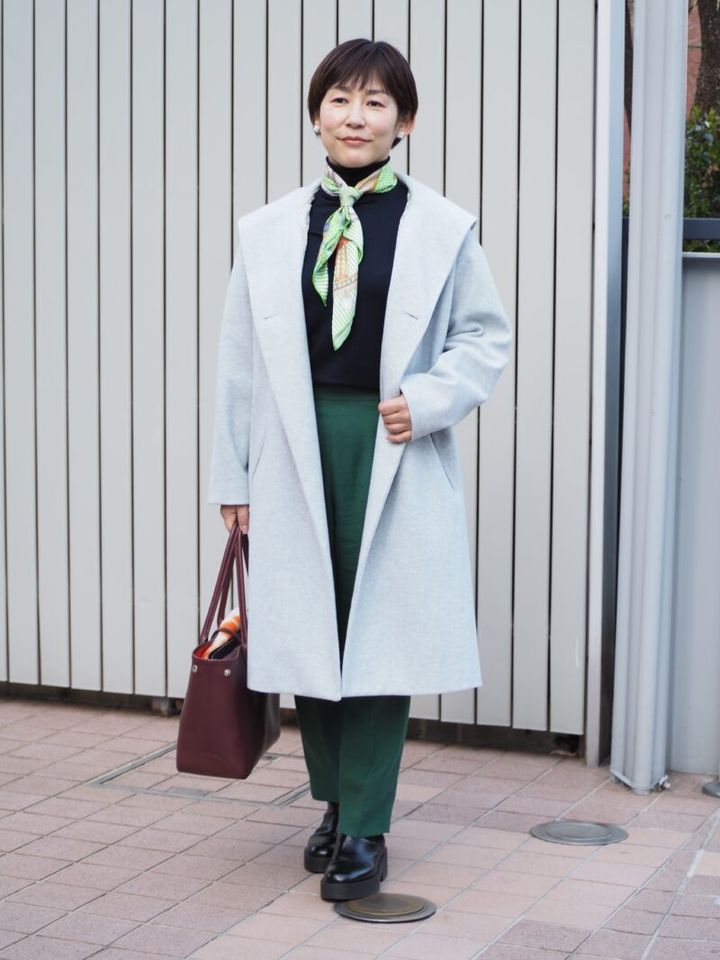 明るいトーンのコートと、顔まわりを明るく映すスカーフが印象的なきれいめスタイル。「柄ものや鮮やかな色が大好きなので、コーディネートのどこかに必ず取り入れています」と、近藤さん。アイスブルーのコートはもちろん、コーディネートを引き締めるワインレッドのバッグとグリーンのパンツも◎。