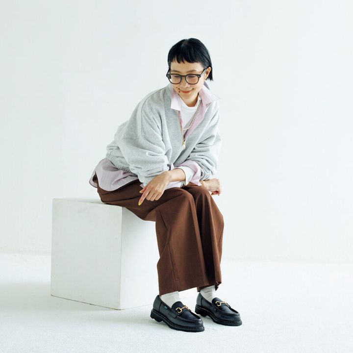 ローファー¥94,600 /パラブーツ(パラブーツ青山店)、ジッププルオーバー¥8,800 /ラッセルアスレティック(グレースインターナショナル)、ハイネックカットソー¥7,700 /コンジェペイエ アデュートリステス、シャツ¥29,920/アストラット(エディット ユナイテッドアローズ梅田店)、パンツ¥36,300 /タンジェント(ザエディット ストア)、パールネックレス¥11,000/アデュートリステス、メガネ¥19,800 /ザベッドフォード ホテル(キングスター)、ソックス¥3,300 /パンセレラ(真下商事)