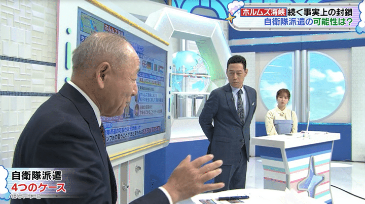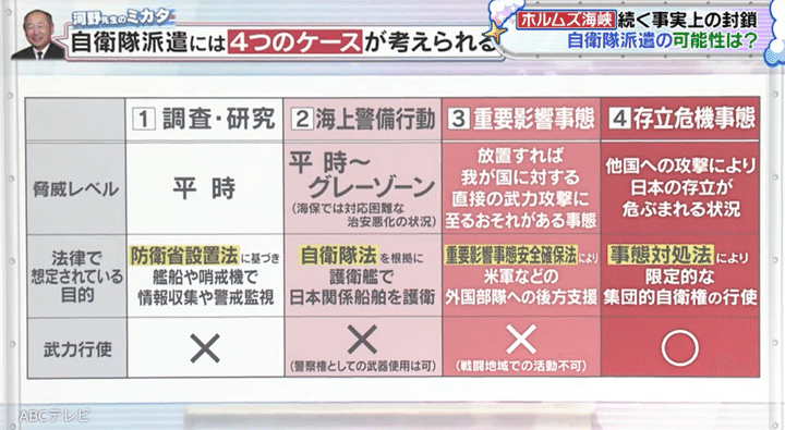 自衛隊トップの第5代統合幕僚長を務めた河野克俊氏いわく、自衛隊派遣には4つのケースがあるという。その中で自衛隊が武力行使できるのは、存立危機事態(他国への攻撃により日本の存立が危ぶまれる状況)のみ。この問題は過去にもあり、そのたびに日本は“憲法9条問題”によってがんじがらめで動けないため、「ここに手を付けない限り(歴史は)繰り返しになる」と河野氏は主張した。
