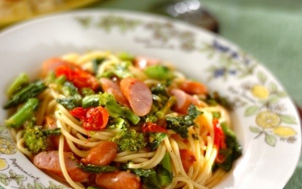 冷蔵庫によくあるソーセージと菜の花で作る、お手軽パスタです。パスタを茹でている間に具材を炒めておけば、パパッと15分で完成。パスタ全体にニンニクの風味とソーセージのコクがよく効いていて、お腹も心も満たしてくれます。