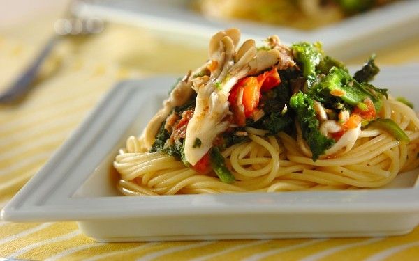 菜の花のほのかな苦みとマイタケの豊かな香りを存分に生かしたペペロンチーノです。ツナ缶で旨味をプラスするのがポイント。ニンニクの風味と赤唐辛子のピリ辛さが食欲をそそり、ワインともよく合います。
