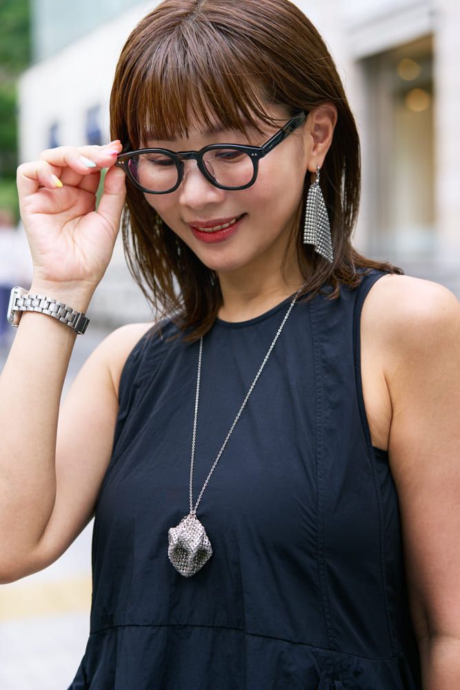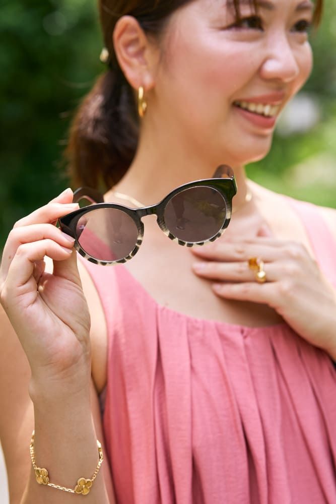 視力がいいので度は入っていない伊達メガネを。 調光だから、紫外線を浴びると茶色のレンズになります。サングラスのままで仕事先にお邪魔することはできないけれど、調光メガネだと、そのあたりも安心。つけ外しがないのもラクでいいですね。あとは、メガネは目周りのシワやたるみなど七難隠してくれるのもよくて、いろいろな面で使えるサングラスなんです。
