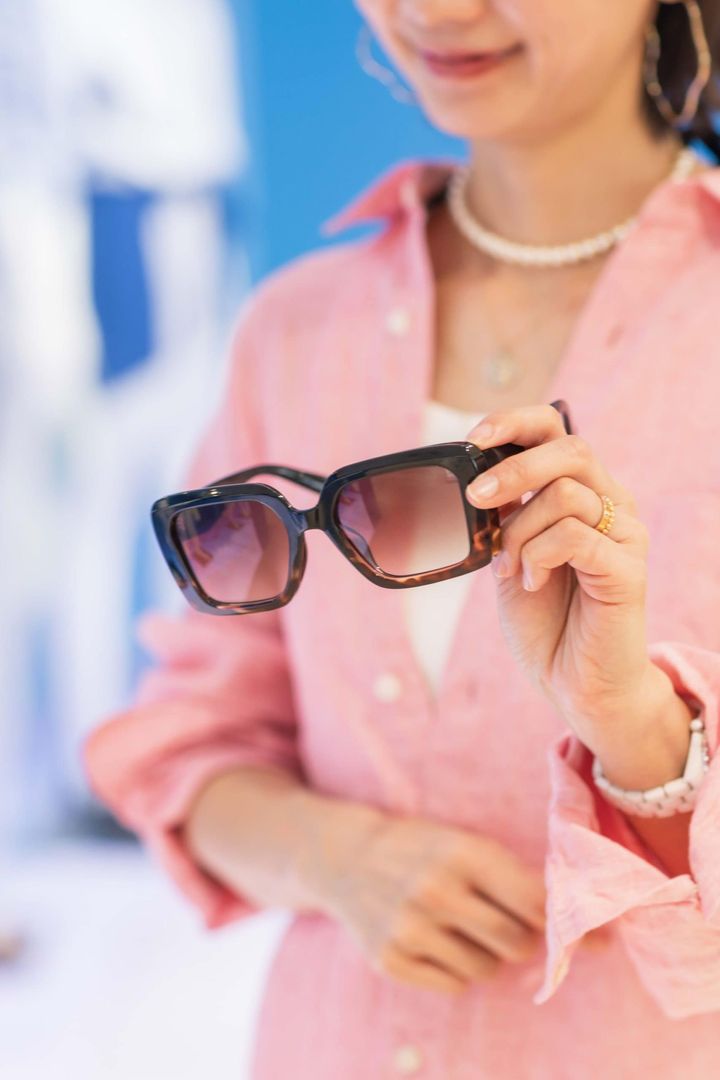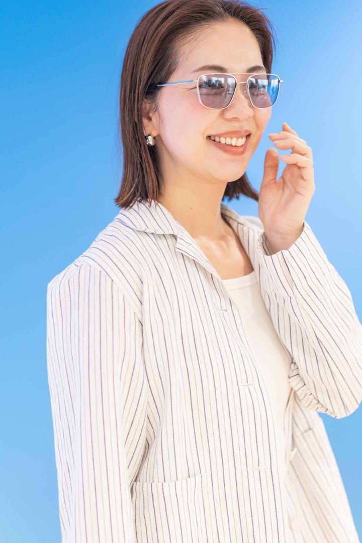 「上品に見せてくれるメタルフレームは、今季もシャレ見えするアイテムです。細めのフレームは顔なじみがよく、程よいアクセントに演出してくれます。ダブルブリッジのデザインが今っぽく、シンプルなコーデと合わせても主張し過ぎず、落とし込みやすい。ノーメイクでも目に印象を与えるブルーレンズは知的でクールな雰囲気を演出し、日常使いにも◎」