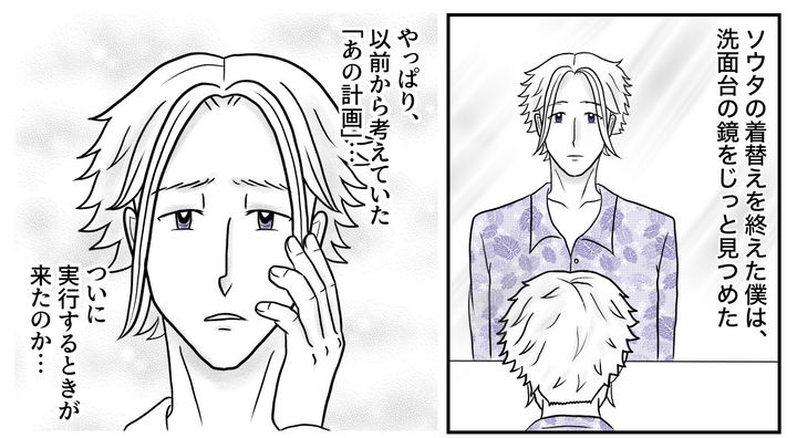僕はソウタを着替えさせ、汚れたソウタの服を洗濯機に放り込むと、洗面台の鏡をじっと見つめた。こうなったらあの作戦を決行するしかない。劇的に生まれ変わるんだ……! 後ろでアズミが何やら叫んでいたが、僕の耳には入らなかった。