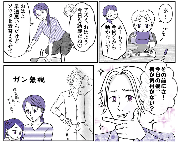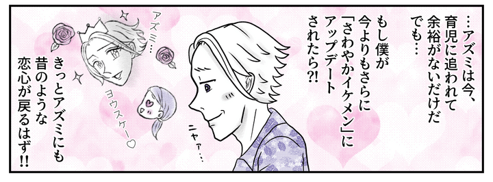 でもせっかくオシャレをしてアピールしても、アズミにはまったく響かない。レイカには「パパ、鏡ばっかり見て。ナルシストなの?」なんて言われる始末……。僕はただアズミにときめく感覚を取り戻してほしいだけ。こうなったら育児の忙しさを吹き飛ばすほどの「理想の王子様」にアップデートしようと決意したのだった。