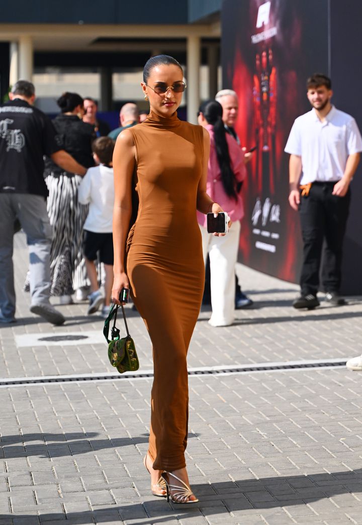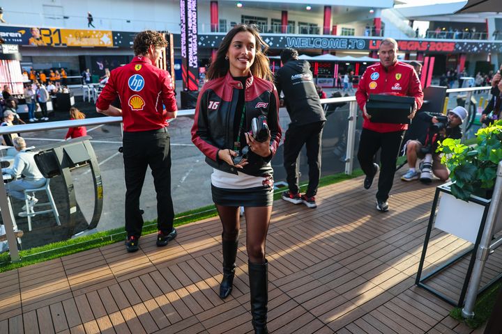 この日はシャルルのカーナンバー「16」とF1ロゴが配された、アイコニックなレーシングジャケットを主役に。タイトなミニスカート、足元はブラックのロングブーツで固めることで、モータースポーツの熱量とストリートなモード感を見事に融合させている。