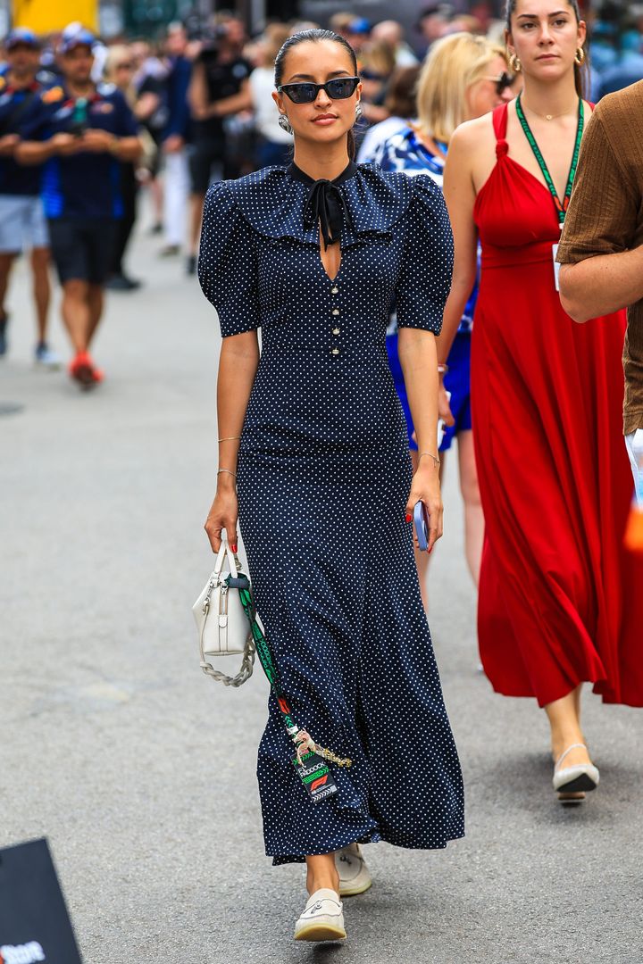サーキットの情熱をそのまま体現したような、圧巻のディープレッド・ルック。シャーリングが効いたドレスに、花が咲き誇るサンダルとバッグ。すべてを赤で統一しながら、質感の違いで奥行きを出す高度なテクニックを披露した。