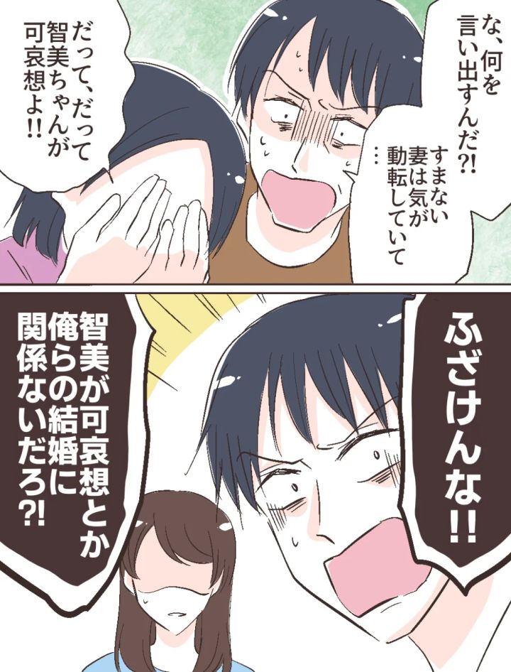 義母の言葉に「な、何を言い出すんだ!?すまない。妻は気が動転していて・・」義父が驚きながら謝る隣で、「だって、だって智美ちゃんが可哀想よ!!」と義母が言い出し、「ふざけんな!!智美が可哀想とか俺らの結婚に関係ないだろ!?」と修吾が怒り出しました。