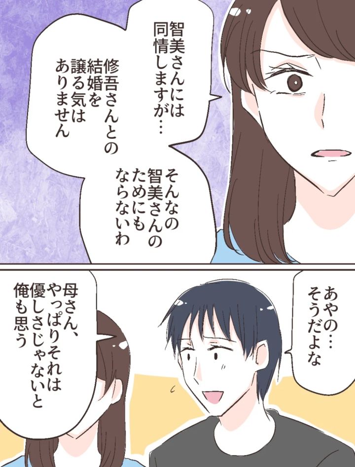 「智美さんには同情しますが、修吾さんとの結婚を譲る気はありません。そんなの智美さんのためにもならないわ」私がそう言うと、「あやの・・そうだよな」と、少しホッとしたようにそう言った後、「母さん、やっぱりそれは優しさじゃないと俺も思う」と言う修吾。