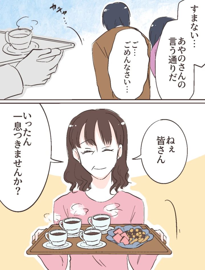 そう言われた義父は、「すまない・・あやのさんの言う通りだ」と頭を下げ、「ご、ごめんなさい・・」と義母も平謝り。すると、「ねぇ皆さん、いったん一息つきませんか?」そう言ってお母さんがコーヒーとクッキーを運んで来てくれました。