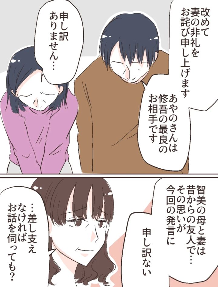 「あらためて妻の非礼をお詫びします。あやのさんは修吾の最良のお相手です」義父が頭を深く下げると、「申し訳ありません・・」そう言って義母も頭を下げました。「智美の母と妻は昔からの友人で・・その思いが今回の発言に・・申し訳ない」義父の言葉に、「・・差し支えなけれなお話を伺っても?」お母さんがそうたずねました。