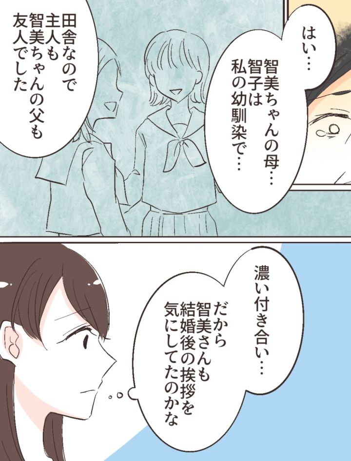 「はい・・智美ちゃんの母、智子は私の幼馴染で・・田舎なので主人も智美ちゃんの父も友人でした」話を聞いていた私は、「濃い付き合い・・だから智美さんも結婚後の挨拶を気にしてたのかな」と心の中で呟いたのでした。