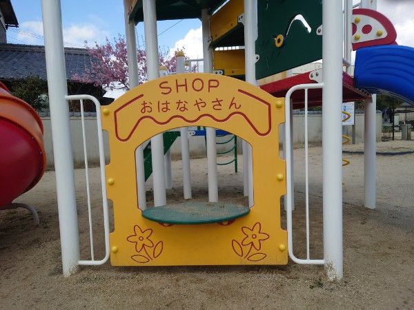 「SHOPおはなやさん」の可愛らしいブースがありお店屋さんごっこもできます。カウンターで物を置ける台もあります。
