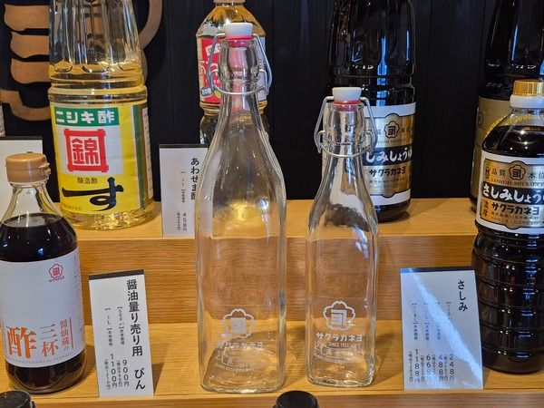 また、今では珍しくなった醤油の量り売りも行っており、専用の500mL・1L瓶もあります。