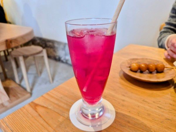 天然の美しく鮮やかな色合いが印象的。甘酸っぱく爽やかな味で、飲むとちょっと体力が回復した気分になりました。