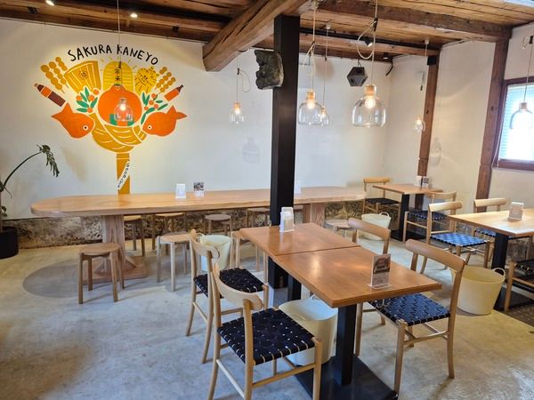 木の梁が露出した天井と、コンクリート打ちっぱなし風の床、そして木製のインテリア。歴史ある「蔵」ならではの安心感がありながら、ペンダントライトの柔らかな光が、モダンで洗練された空気を演出。奥の壁には、地元の名産や文化をモチーフにした温かみのあるイラストが描かれており、空間をやさしく和ませています。