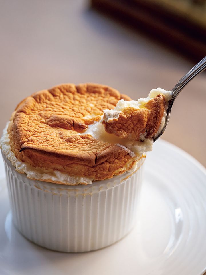締めくくりはシェフ自慢の“スフレ・グラン・マルニエ”を。「素材の配合とオーブンの温度が重要」とシェフ。その軽やかさはまさに至福の一品。
