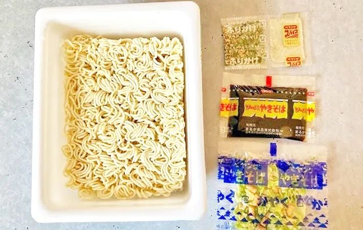 中に入っているかやく、ソース、ふりかけ、スパイスは取り出しておきましょう。
