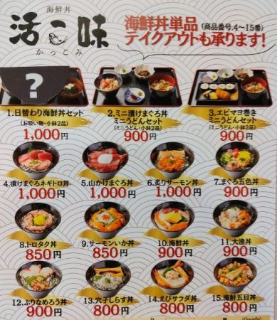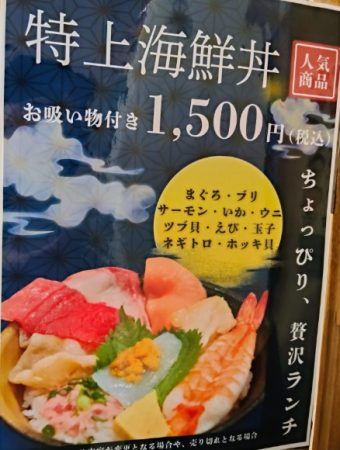初めての訪問ゆえ普通の日替わり海鮮丼(1,000円)にしましたが、特上海鮮丼も気になるところ。お値段はちょっとだけお高めの1,500円。
